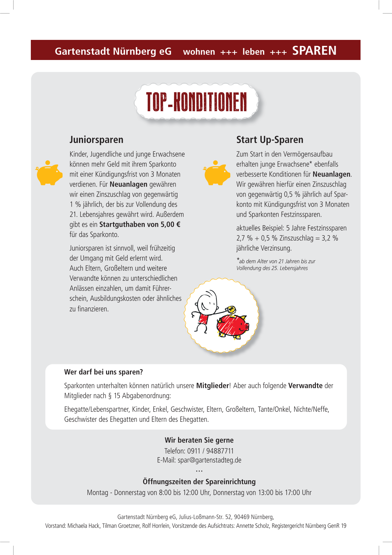 Konnten wir Ihr Interesse gewinnen, so freuen wir uns auf Ihren Besuch zu den genannten Öffnungszeiten, ihren Anruf oder eine Nachricht per eMail unter spar@gartenstadteg.de